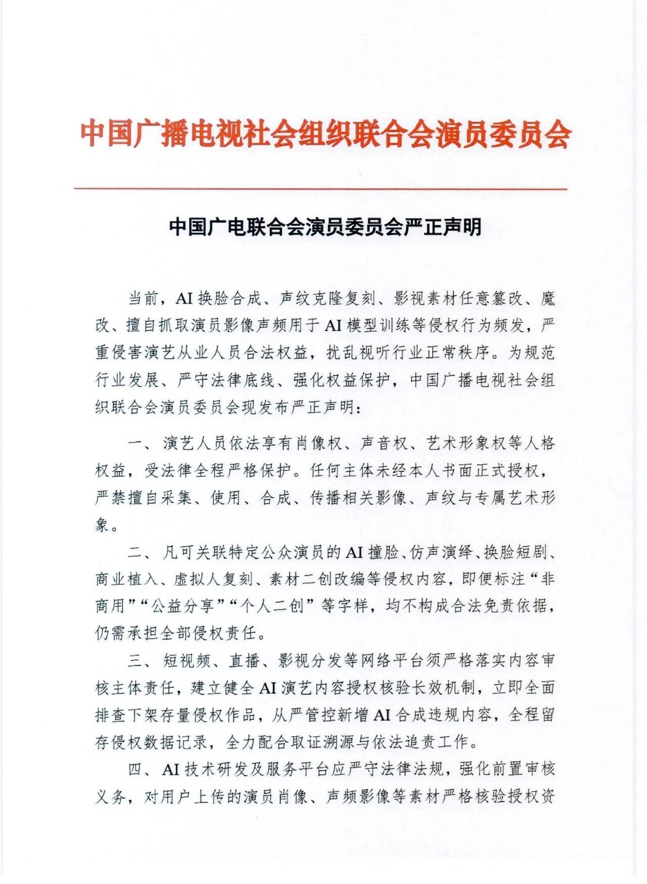 当前,AI换脸合成、声纹克隆复刻、影视素材任意篡改、魔改、擅自抓取演员影像声频用于AI模型训练等侵权行为频发,严重侵害演艺从业人员合法权益,扰乱视听行业正常秩序。为规范行业发展、严守法律底线、强化权益保护,中国广播电视社会组织联合会演员委员会现发布严正声明。